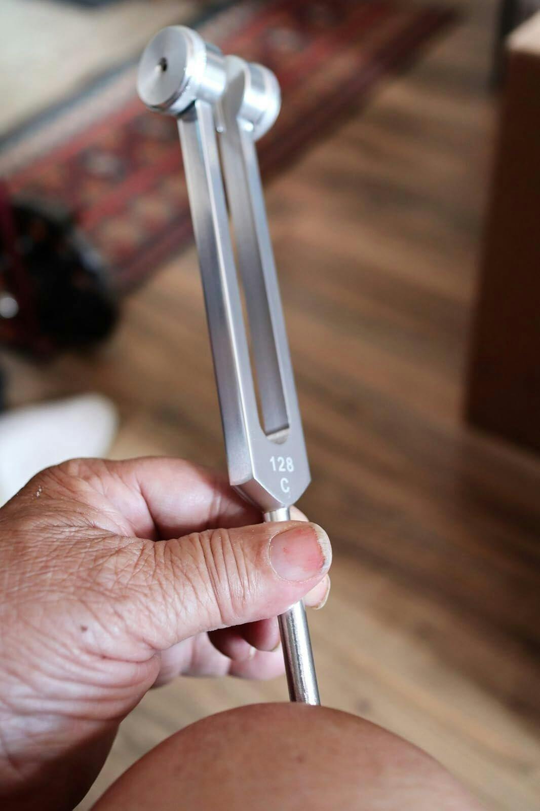 Hold the vibrating stem to one of the recommended placement areas (as shown in the instructions) to let the 128 Hz frequency travel through nerves and tissues until the vibration fades out.